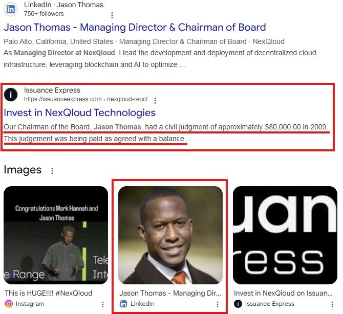 Jason Thomas - If that's really his name - certainly looks the part of a serial fraudster. His Linkedin and other online history is a plethora of pure self-promotion, with zero information provided by independant 3rd party sources - with the notable exception of the civil judgment against him for $80k, which is hidden behind a paywall. Neither he, nor most of the other people